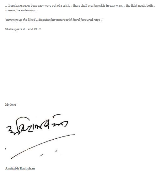 अमिताभ ने अपने ब्लॉग पर भी यह फोटो साझा की है और लिखा है, "संकट से बाहर निकलने के आसान तरीके कभी नहीं रहे। आसान तरीकों में संकट हमेशा हो सकता है। लड़ाई के लिए दोनों ही जरूरी हैं। प्रयास में तेजी लाओ। खून में उबाल लाओ ...कठिन अनुग्रह प्राप्त उत्साह से अपने अच्छे व्यवहार को अलग पहचान दो।"